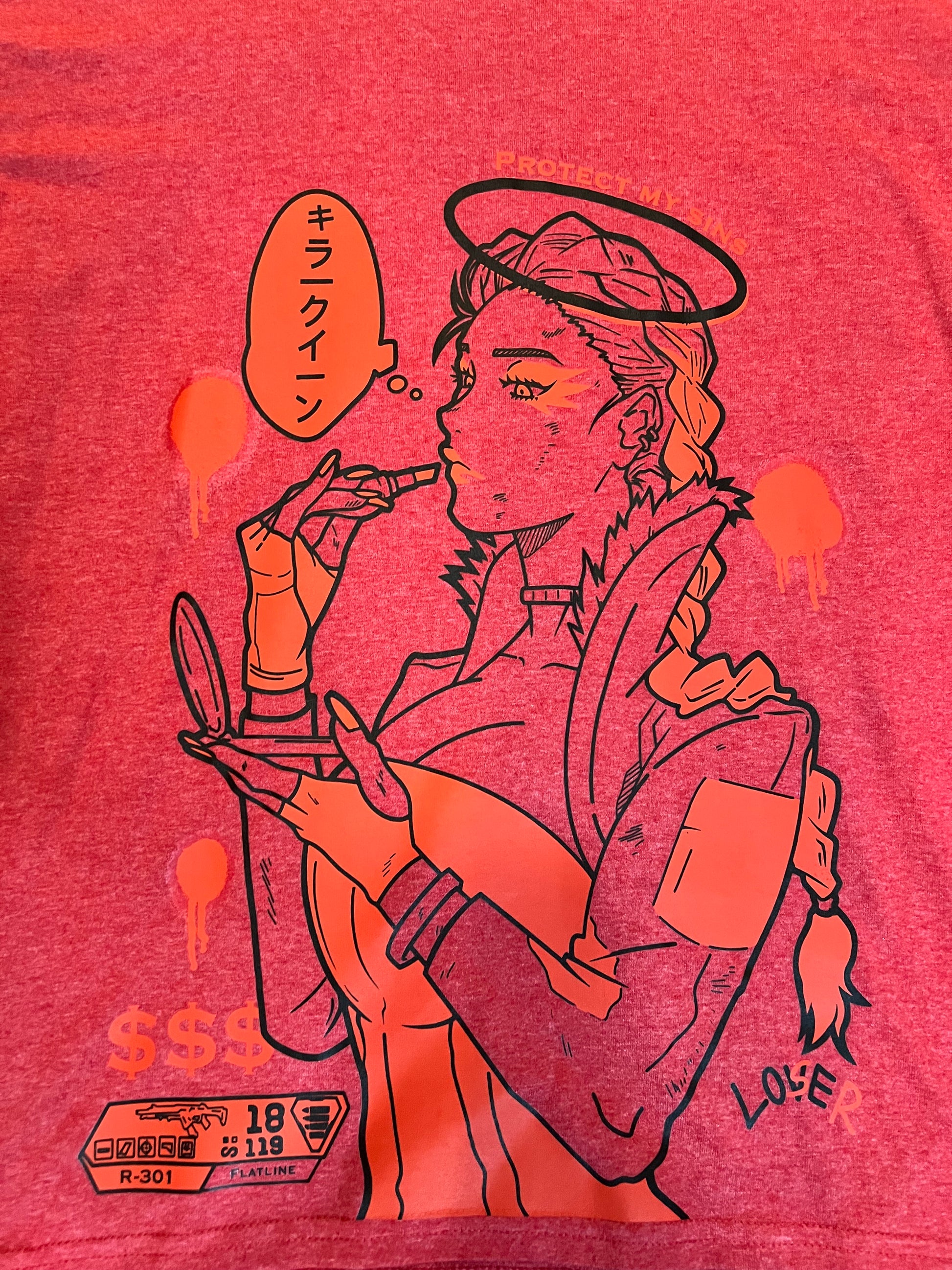 This shirt is based off the apex queen of all legends. Beauty of beauties, a diamond. Features screen printing on the front of the shirt. Vinyl on the back and arm.